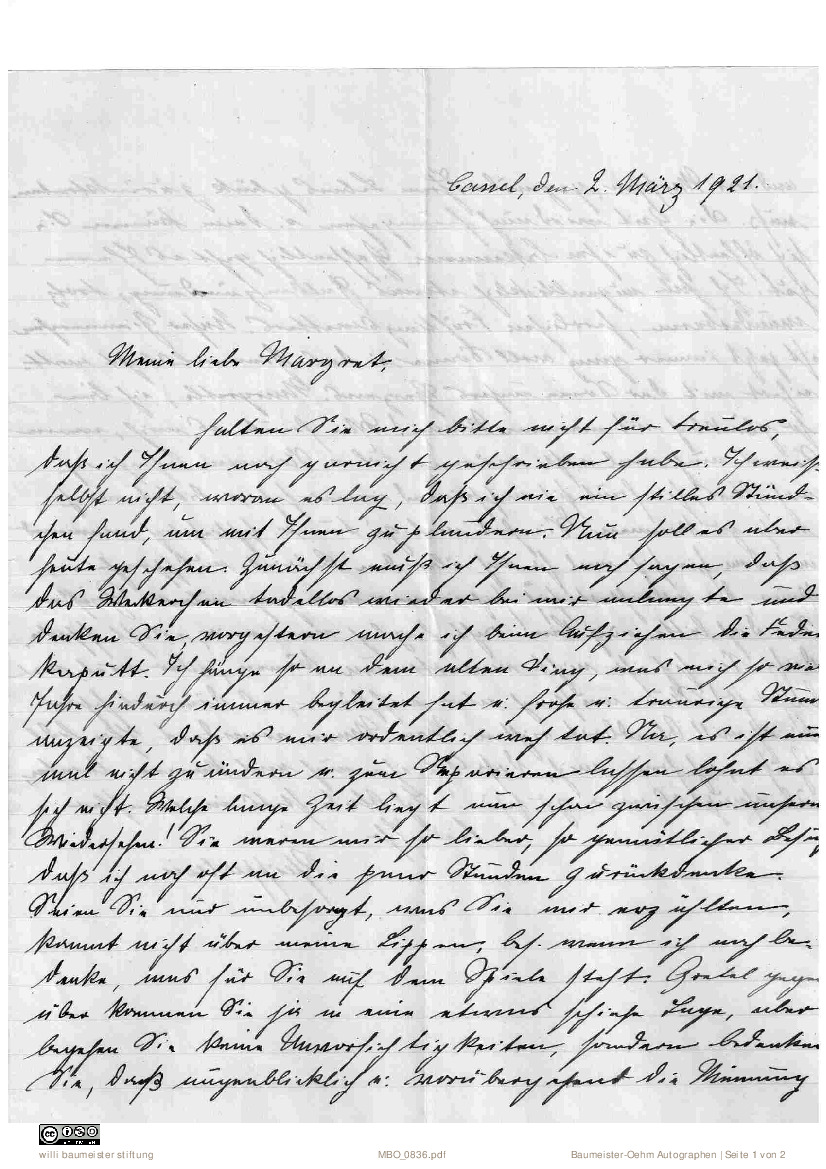 Auszug: ... aber begehen Sie keine Unvorschichtigkeiten, sondern bedenken Sie, daß unglaublich und vorübergehend die Stimmung anderer Menschen gegenüber Ihrem Lebensglück zurücktreten muß. Die zeit wird auch herumgehen und dann können Sie sich öffentlich zu ihm bekennen.