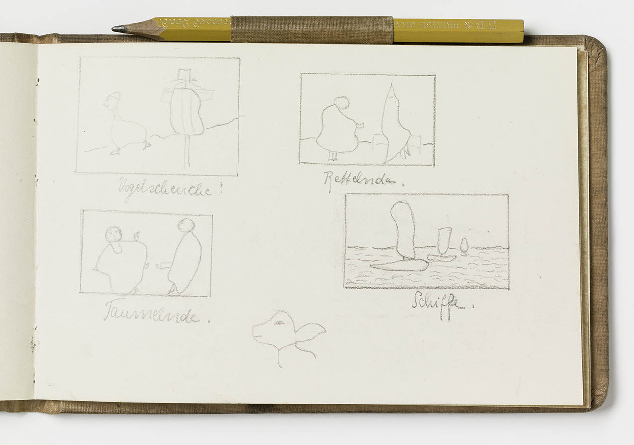 "Vogelscheuche." "Bettelnde." "Taumelnde." "Schiffe." (jeweils Mitte unter dem Bildmotiv)